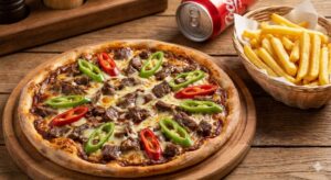 Kavurmalı Pizza (Dana kavurma, yeşilbiber, kırmızı biber, özel sos, pizza peyniri) + Patates Kızartması + Kutu İçecek