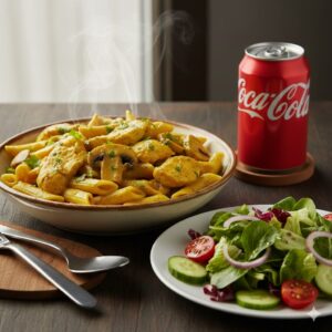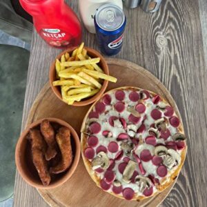 Small Pizza (Sosis, mantar, kaşar peynir) + Chicken Fingers (3 Adet) + Patates Kızartması + Kutu İçecek