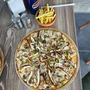 Mexicano Pizza (Tavuk, mantar, jalapeno biberi, özel sos, pizza peyniri) + Patates Kızartması + İçecek (1 L.)