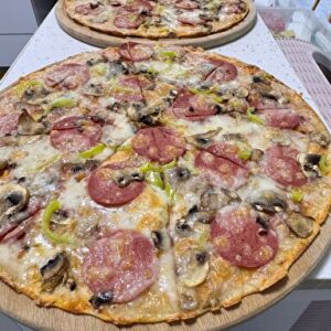 Özel sos, çift kat pizza peyniri, mantar, salam, sosis