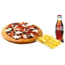 Vejetaryen Pizza (Mantar, mısır, siyah zeytin, yeşil zeytin, yeşilbiber, özel sos, pizza peyniri) + Patates Kızartması + Kutu İçecek
