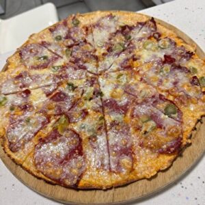 Özel sos, pizza peyniri, sucuk, salam, sosis, mantar, domates, mısır, siyah zeytin yeşil zeytin