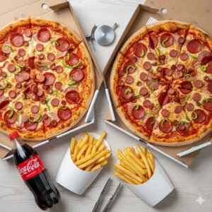 Mix Pizza (Büyük) (2 Adet) (Sucuk, salam, sosis, pizza peyniri, özel sos, yeşilbiber) + Duble Patates Kızartması (2 Porsiyon) + İçecek (1 L.)