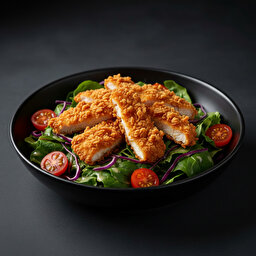 Çıtır tavuk, iceberg marul, havuç, salatalık, domates, mısır, kaşar peyniri