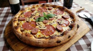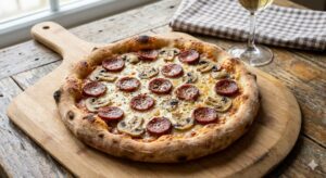 Kaşar peyniri, mantar, sosis, pizza sosu