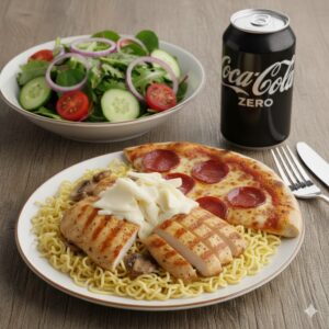 Chicken Pizza (Orta) (Kaşar peyniri, dilim çıtır tavuk, yeşil zeytin, domates, yeşilbiber, mantar, pizza peyniri, özel sos) + Duble Patates Kızartması + İçecek (1 L.)