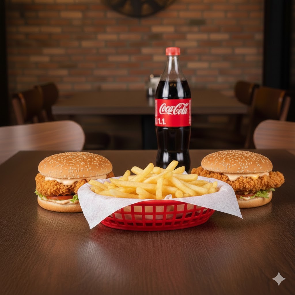 2 Adet Tavuk Burger yada Çıtır Burger, 200 gr. Patates Kızartması ve Seçime bağlı 1 lt. İçecek ile servis edilir.