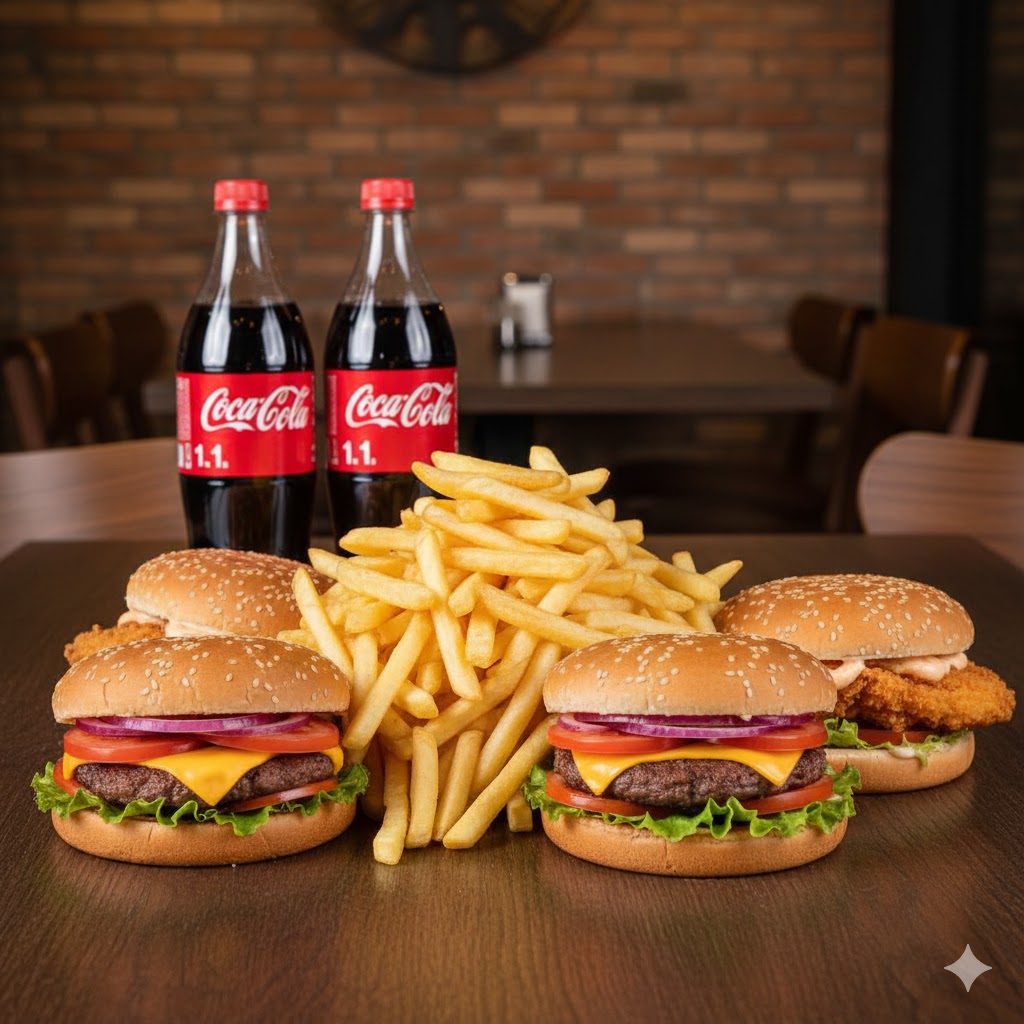 2 Adet Hamburger, 2 Adet Tavuk Burger yada Çıtır Burger, 400 gr. Patates Kızartması ve Seçime bağlı 2 Adet 1 lt. İçecek ile servis edilir.