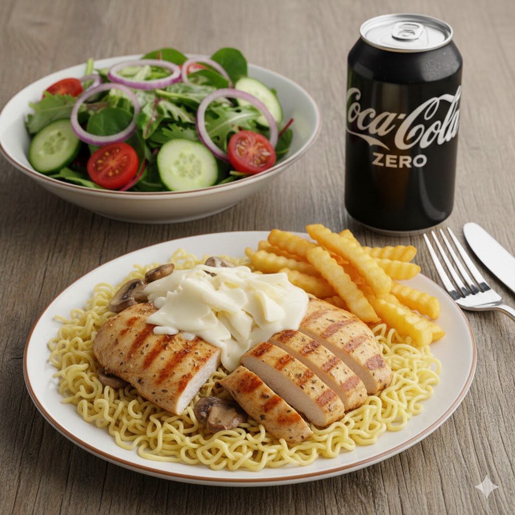 Noodle + Kaşar Peyniri + 2 Adet Tavuk Fileto + Mantar + Patates Kızartması + Kutu İçecek